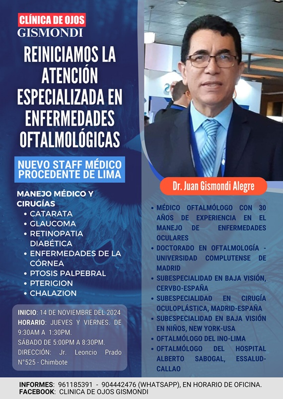 De esa manera invitamos a toda la comunidad chimbotana a asistir a la Gran Campaña de Atención Oftalmológica programada para este lunes 3 y martes 4 de Marzo en nuestras instalaciones del jirón Leoncio Prado N° 525- Chimbote Casco Urbano, a media cuadra de la Plaza de Armas de la ciudad. Estará atendiendo el reconocido médico chimbotano Dr. Juan Gismondi Alegre, quien cuenta con una importante trayectoria en el INO (Instituto Nacional de Oftalmología) de la ciudad de Lima y en el hospital de Essalud “Alberto Sabogal” del Callao; además tiene un doctorado en Oftalmología en la Universidad Complutense de España, Subespecialidad en cirugía Oculoplástica en Madrid España; subespecialidad en Baja Visión en Nueva York- USA, entre otros.