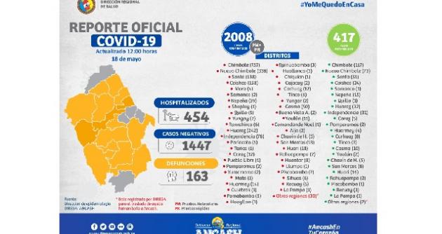 Chimbote en Línea. – El coronavirus ha causado hasta hoy la muerte de 163 personas en Áncash, pero 417 se han recuperado de la pandemia en una región con 2,008 casos confirmados.