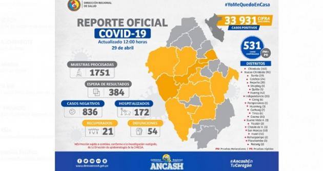 Hasta el momento se han procesado 1,751 pruebas, de las cuales han dado positivo en Áncash 531, negativos 836, en espera 384. Hay 172 hospitalizados y 21 pacientes se han recuperado.